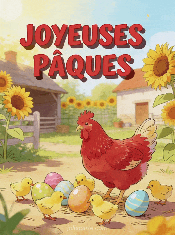 Envoyez cette image « Joyeuses PĂąques » avec sa poule et ses poussins pour fĂȘter PĂąques. Voyez aussi une carte PĂąques, un gif joyeuses PĂąques ou un gif de PĂąques gratuit.