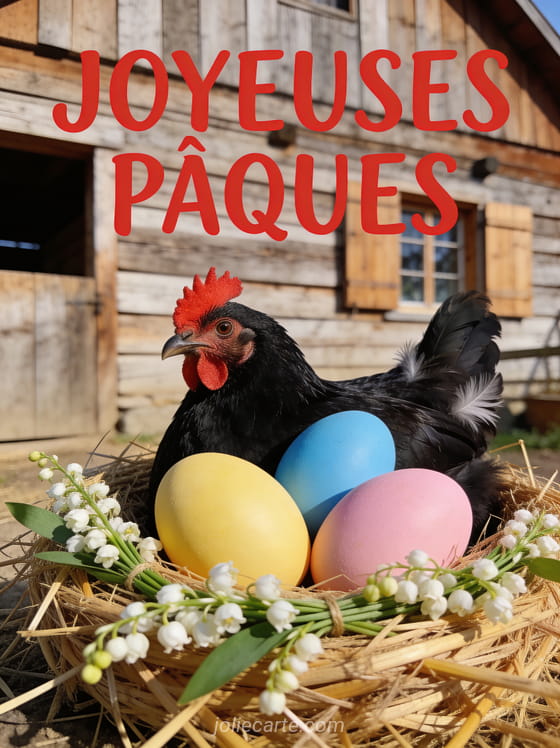 Envoyez cette image « Joyeuses PĂąques » avec sa poule couvant des Ćufs colorĂ©s pour cĂ©lĂ©brer les fĂȘtes. Voyez aussi une carte cloches de PĂąques, une carte PĂąques drĂŽle ou une carte PĂąques gratuite.