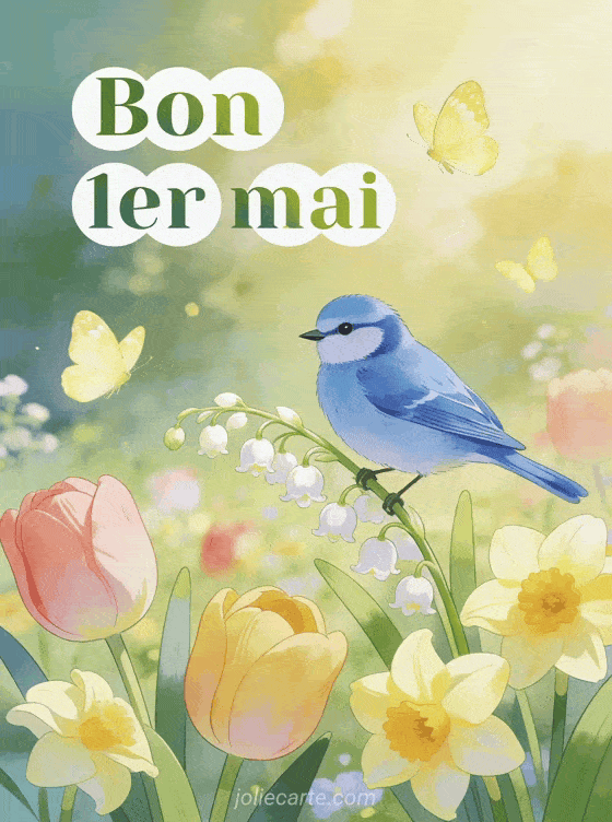 Envoyez cette carte colorée avec une mésange bleue et du muguet pour souhaiter un bon 1er mai printanier. Découvrez aussi un brin de muguet porte-bonheur, un joyeux 1er mai ou une photo de muguet.
