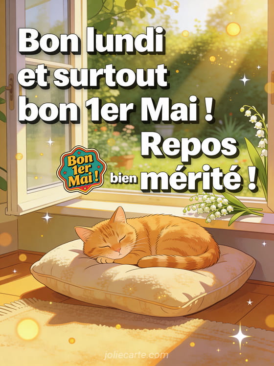 Souhaitez un bon lundi du 1er mai à vos proches avec cette image chaleureuse pour un repos bien mérité. Envoyez aussi un bon dimanche du 1er mai, une carte pour le pont du 1er mai ou une image du pont du 1er mai.