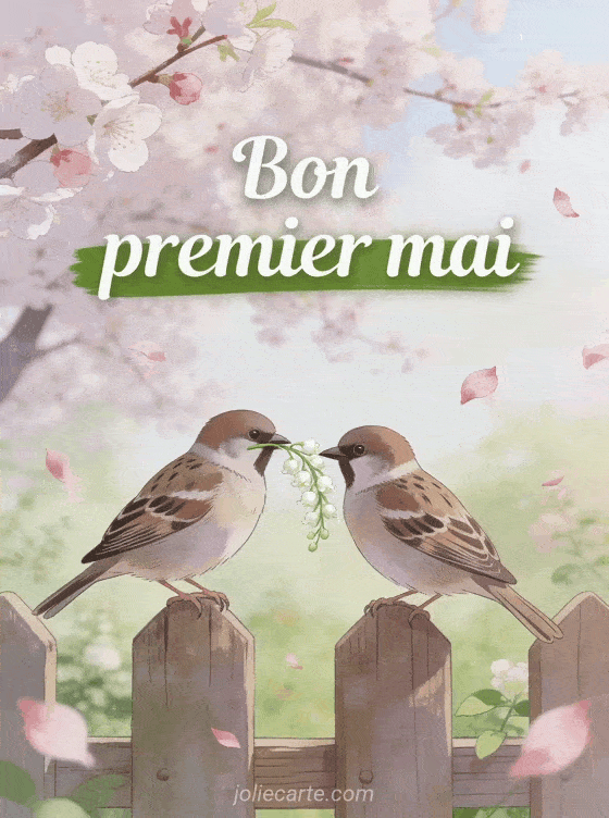 Envoyez cette image tendre de deux moineaux partageant un brin de muguet sous un cerisier en fleurs. Découvrez aussi un gif de muguet, un brin de muguet ou des photos de muguet.