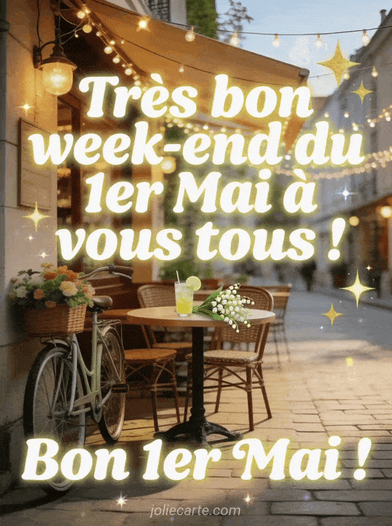 Souhaitez un trÚs bon week-end du 1er mai à tous vos proches avec cette image festive et lumineuse. Découvrez aussi un bon week-end du 1er mai, un bon lundi du 1er mai ou un bon dimanche du 1er mai.