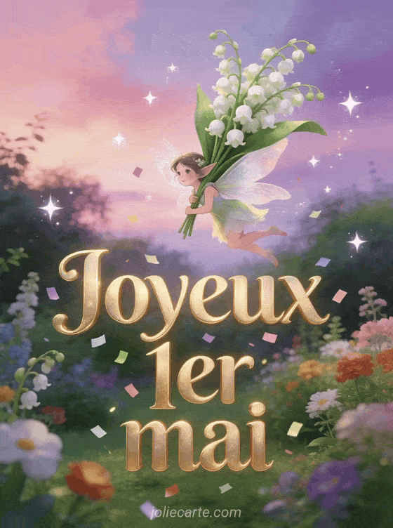 Envoyez cette carte 1er mai féerique avec une fée portant un brin de muguet magique au-dessus d'un jardin enchanté. Découvrez aussi une photo du 1er mai, le muguet rose ou des photos de muguet.