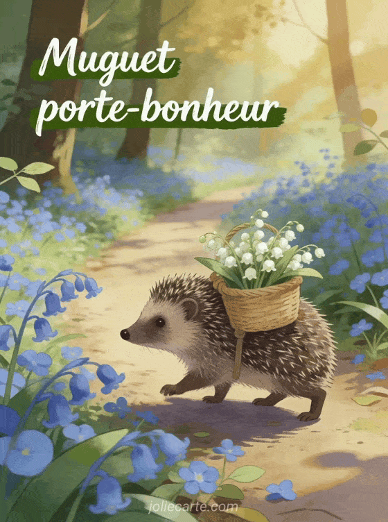Envoyez cette carte muguet avec un hérisson portant un panier de muguet sur un sentier de pervenches. Découvrez aussi la fleur de muguet, un dessin de muguet ou le muguet de mai.