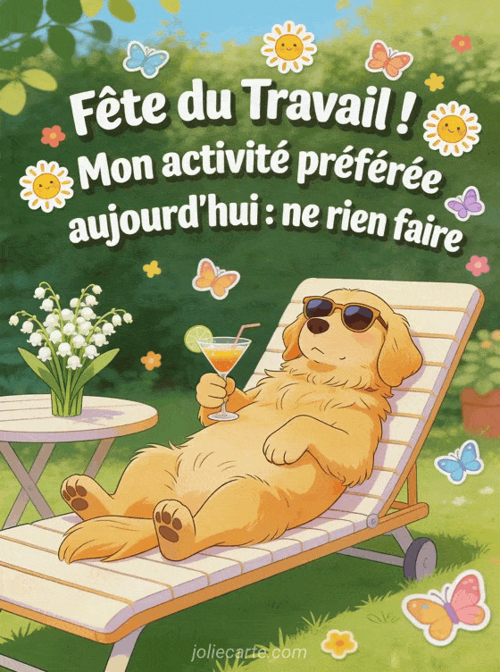CĂ©lĂ©brez la fĂȘte du travail avec humour grĂące Ă cette image drĂŽle et dĂ©tendue. DĂ©couvrez aussi une bonne fĂȘte du travail, une image du 1er mai fĂȘte du travail et muguet ou du 1er mai jour de repos.