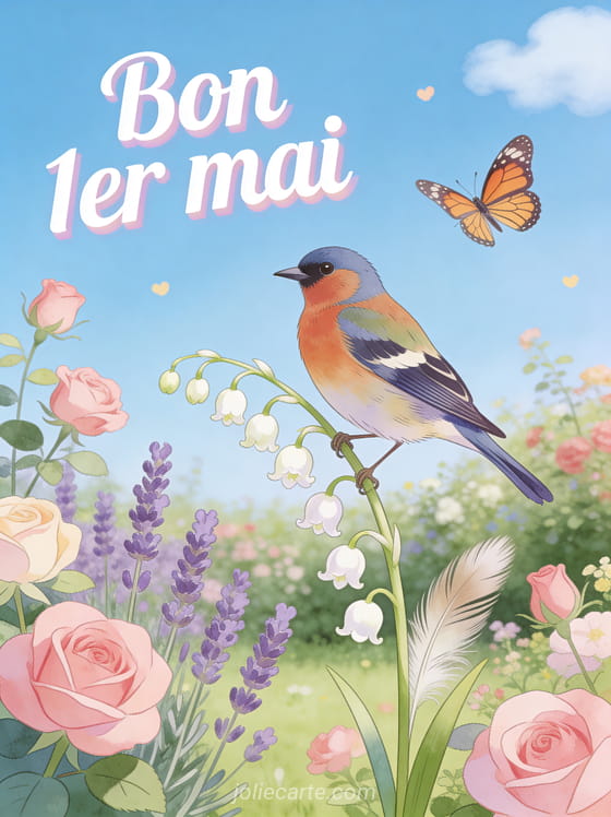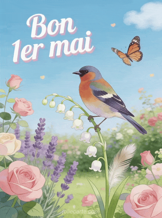 Partagez cette image colorĂ©e d'un chardonneret sur du muguet dans un jardin anglais en fĂȘte pour le 1er mai. Envoyez aussi une carte du 1er mai, un message muguet porte-bonheur ou des images de muguet.