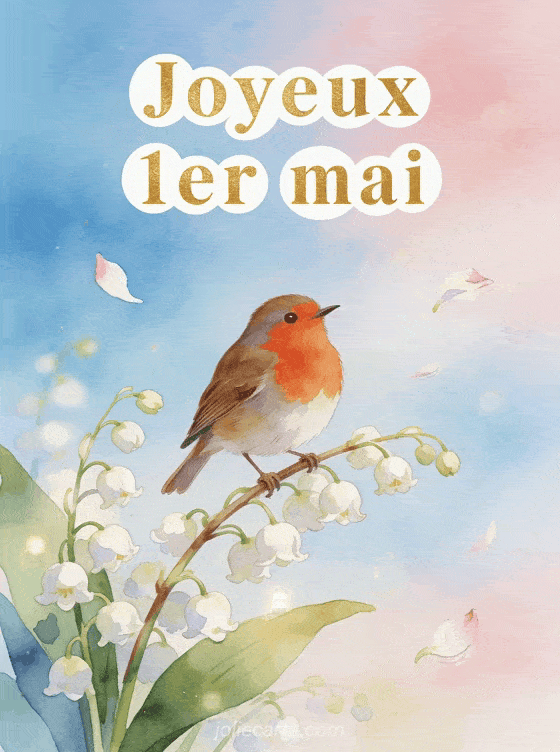 Envoyez cette jolie image d'un rouge-gorge posé sur un brin de muguet pour souhaiter un joyeux 1er mai. Découvrez aussi un bouquet de muguet, un brin de muguet ou une image de muguet.