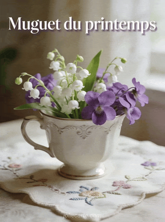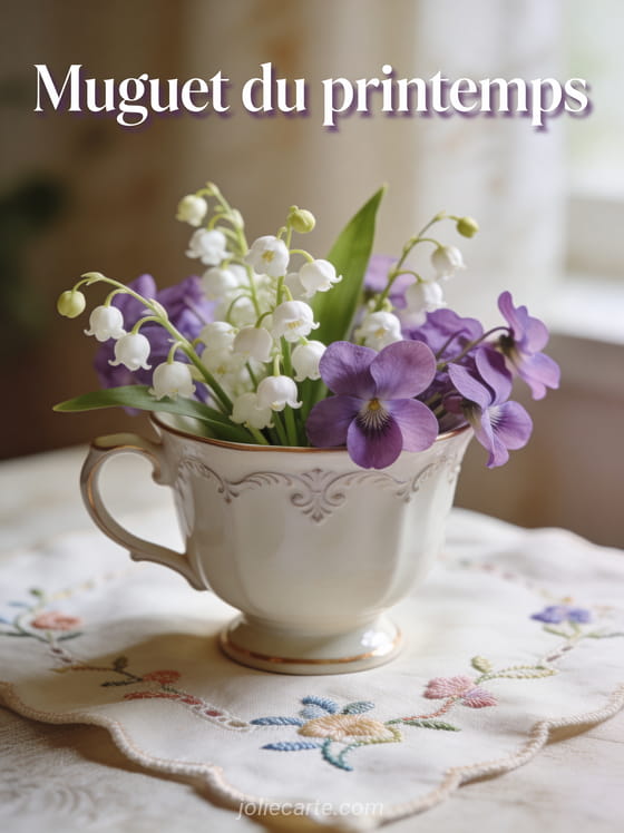 Partagez cette photo raffinée de muguet et de violettes dans une tasse en porcelaine, un charme printanier délicat. Envoyez aussi un muguet porte-bonheur du 1er mai, une image de muguet ou une image du 1er mai.