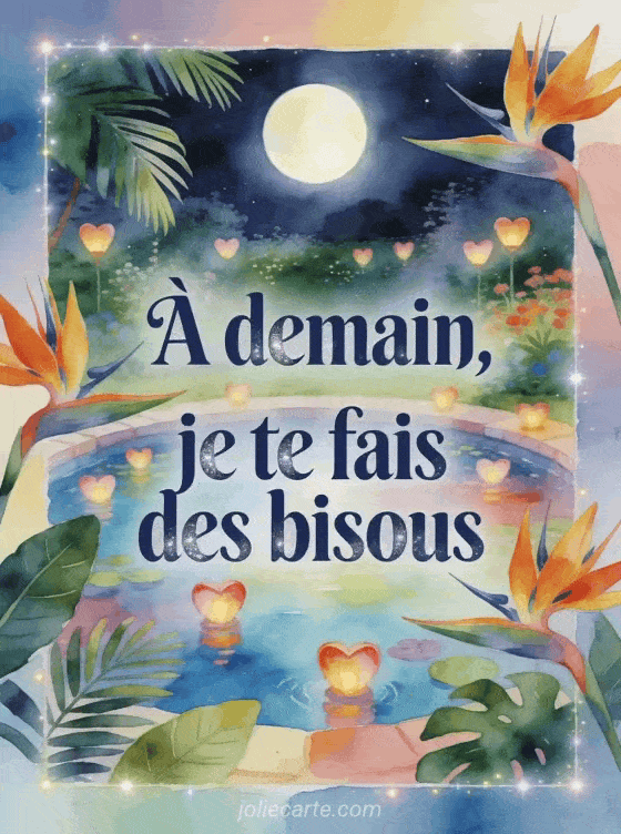 A demain bisous installe une fin d'échange douce, rassurante et pleine de proximité. Cette carte accompagne un oui tendre avant demain, reprend un gif de bisous à envoyer ce soir et prolonge des bisous pour patienter jusqu'au lendemain.