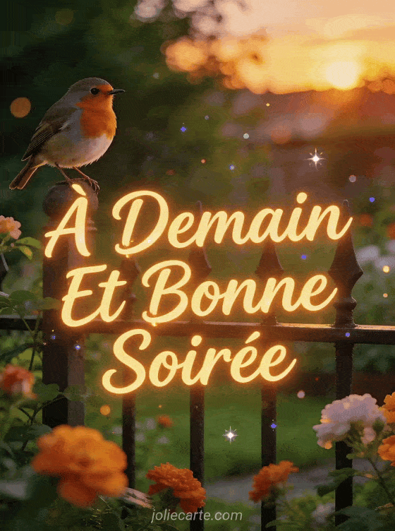 Cette image « à Demain Et Bonne Soirée » exprime un au revoir chaleureux et amical. Un rouge-gorge joyeux sur une clÎture de jardin au crépuscule crée une ambiance accueillante. Explorez aussi une soirée avec bisous, une soirée en images ou nos autres cartes amicales.