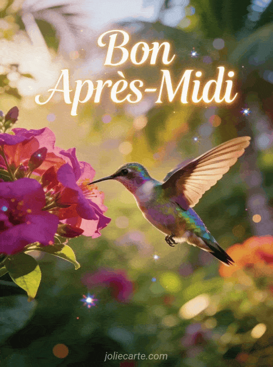 Cette image de nature est à couper le souffle. Un magnifique colibri plane devant des fleurs de fuchsia, ses plumes iridescentes captant la lumière de l'après-midi dans un éclat de couleurs. Le fond en bokeh doux d'un jardin tropical met en valeur cet instant magique de la nature. Voyez aussi notre carte un bon après-midi, notre image gif bon après-midi humour ou notre carte je vous souhaite un bon après-midi.