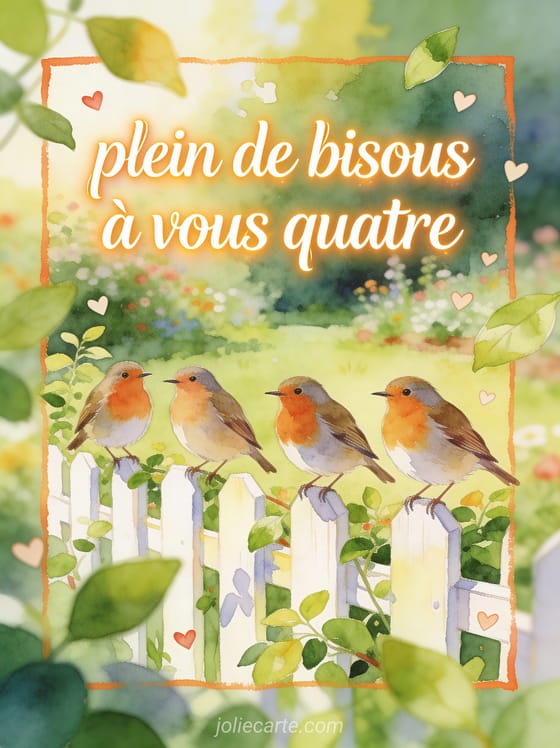 Bisous à tous les quatre convient trÚs bien pour une attention adressée à plusieurs, avec des bisous en gif gratuits, des pensées pleines de bisous et une note de bisous sur ta bouche pour garder un message chaleureux, naturel et facile à partager en groupe.