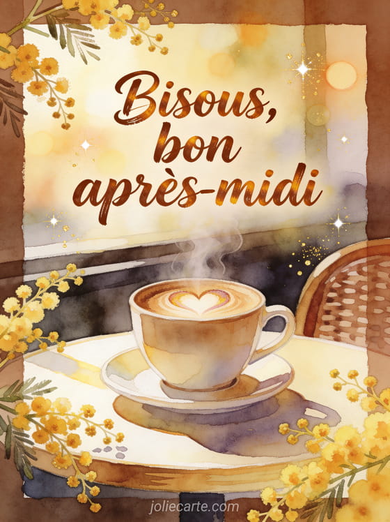 Bisous bon après midi café associe une pause familière à une pensée tendre, idéale pour reprendre souffle dans la journée. Cette carte peut précéder une bonne sieste avec bisous, revenir à un bon après-midi classique ou adoucir une belle après-midi affectueuse.
