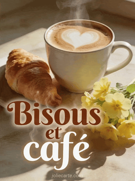 Partagez cette image « Bisous et café » pour envoyer un baiser matinal accompagné de douceur. Découvrez aussi une photo de gros bisous, un bisou rigolo ou des bisous rien que pour toi.