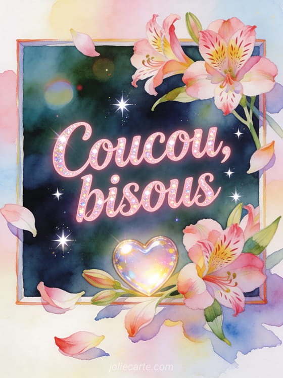 Bisous coucou réunit deux mots simples pour créer une attention tendre et facile à envoyer. Cette carte répond à un petit coucou amical avec gros bisous, rejoint des cartes pour saluer simplement et sert de message pour dire coucou quand tu penses à quelqu'un.
