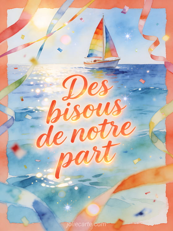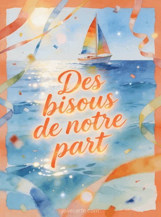 Cette carte gratuite autour de bisous de notre part peut aussi accompagner des bisous de lapin, faire Ă©cho Ă une image de dauphin bisous et prolonger votre message avec un gif de bisous chaleureux, afin dâadresser une pensĂ©e collective simple et affectueuse.