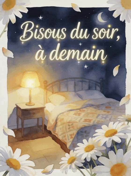 Bisous du soir a demain convient quand le dernier message doit rester tendre et apaisant. Cette carte porte de gros bisous avant demain, reprend un simple bisous Ă demain et s'accorde avec des gifs tendres pour le soir.