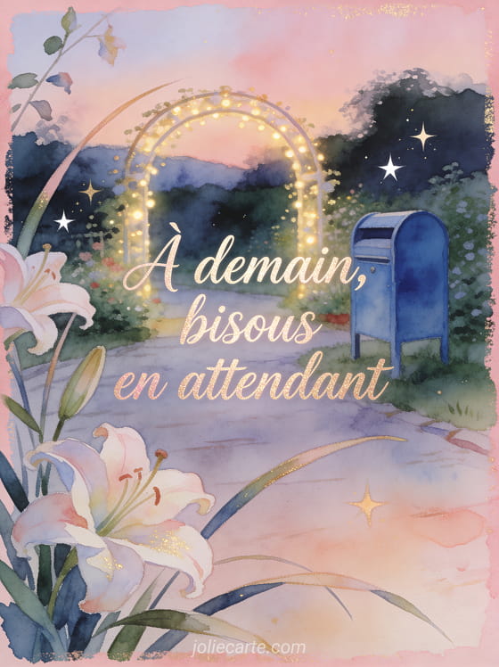 Bisous en attendant demain rassure le destinataire avec une attention simple et proche. Cette carte accompagne une image pour patienter jusqu'Ă demain, complĂšte une photo tendre de bisous et rejoint des gifs Ă envoyer avant demain.