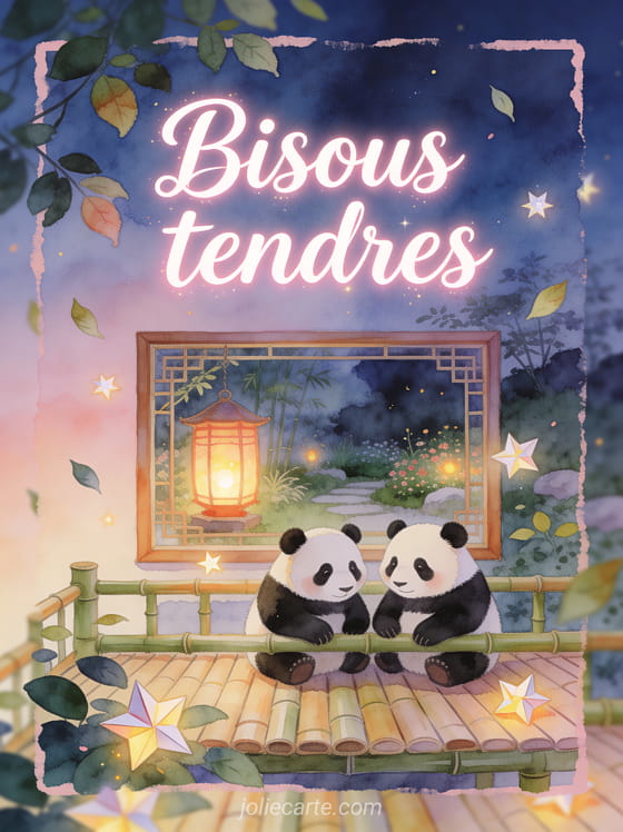 Bisous entre panda donne une tonalite tres tendre a ton message, laisse passer un elan d'affection qui voyage, assume simplement des sentiments personnels et sincĂšres et peut aussi prendre une forme plus joueuse quand tu veux faire sourire avec douceur.