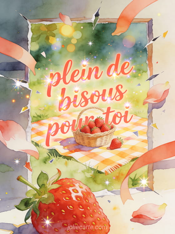 Cette carte bisous fraise apporte une note gourmande et legere a vos messages affectueux. Elle s'accorde avec des bisous aux accents sucres, rejoint un message tendre autour d'un chat et complĂšte de gros bisous en version gif pour varier les plaisirs sans perdre en douceur.