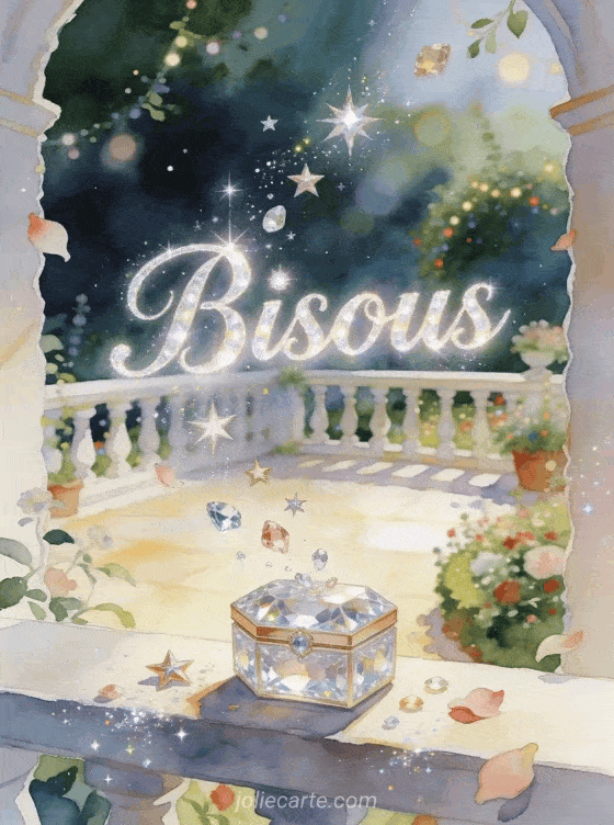Ce bisous gif scintillant anime convient quand tu veux envoyer une attention vive et brillante, tout en pouvant le rapprocher de un gif bisous mariage, des bisous autour d'un the ou des bisous fraternels pour ajuster le style de ton message.