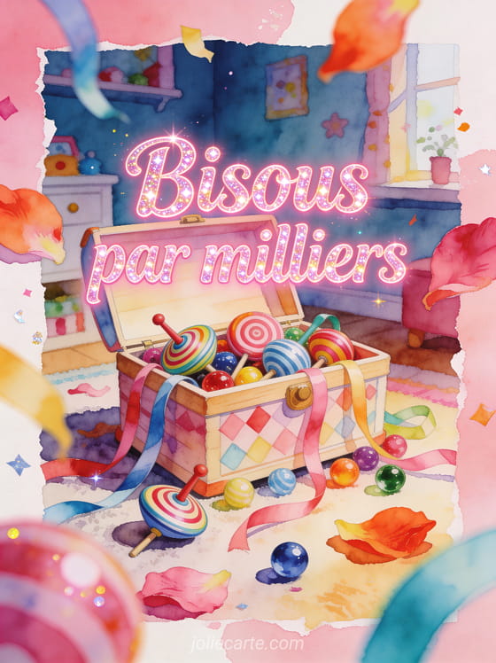 Bisous joujoux apporte une note ludique et affectueuse à votre message, parfaite pour faire sourire avec légÚreté. Pour compléter cet esprit, ajoutez une pluie de bisous, des bisous rouges ou de gros bisous pour vous quatre à votre envoi.
