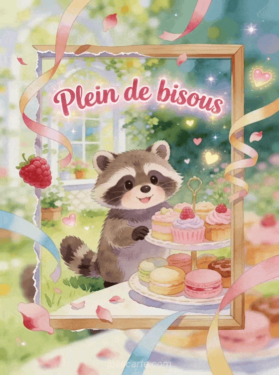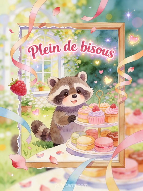 Bisous raton laveur mélange tendresse et malice, parfait pour un message affectueux qui sort un peu de l'ordinaire. Pour varier l'effet, associez un coeur plein de tendresse, une image de bisou toute simple ou des bisous d'Halloween animés à votre envoi.
