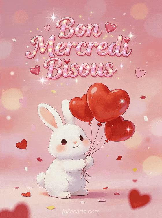 Envoyez tout votre amour ce mercredi avec cet adorable lapin blanc entouré de ballons rouges en forme de coeur dans une atmosphÚre romantique aux tons roses et rouges. Cette scÚne attendrissante avec ses confettis en forme de coeurs qui flottent est parfaite pour une photo de bon mercredi pleine de tendresse. Les teintes douces de cette image de bon mercredi créent une ambiance cùline idéale pour exprimer votre affection. Partagez ce bon mercredi avec ceux qui comptent pour vous et faites-leur savoir qu'ils sont dans vos pensées.