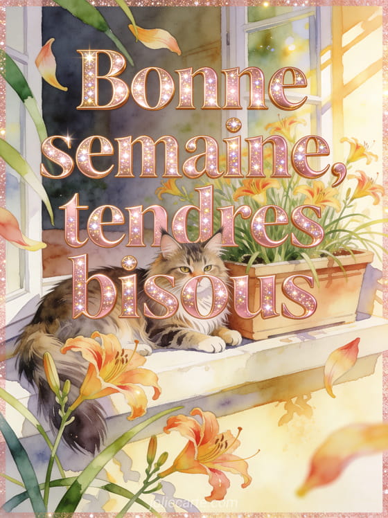 Cette carte bisous tendresse bonne semaine exprime une affection calme et sincÚre, parfaite pour accompagner un proche avec douceur. Elle prolonge un souhait de belle semaine avec bisous, rejoint de belles images pleines d'attention et peut remplacer des images animées pour souhaiter la semaine.