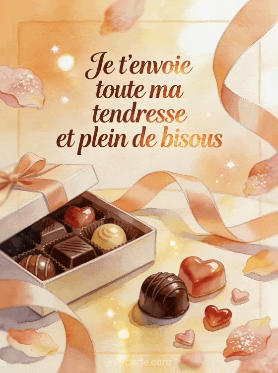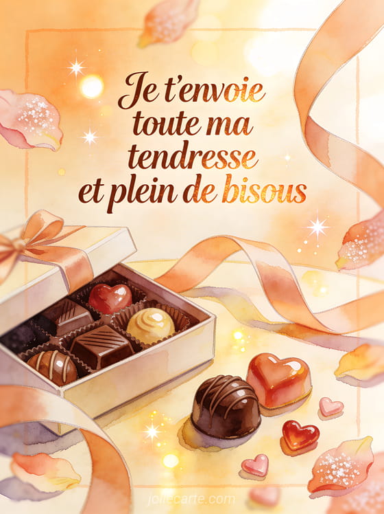 Bisous tendresse et chocolat rĂ©unit douceur affectueuse et petite gourmandise dans un mĂȘme message plein de rĂ©confort. Pour nuancer votre envoi, ajoutez des bisous bien chaleureux, une tendresse de maman ou une carte de gros bisous selon l'Ă©motion que vous voulez transmettre.