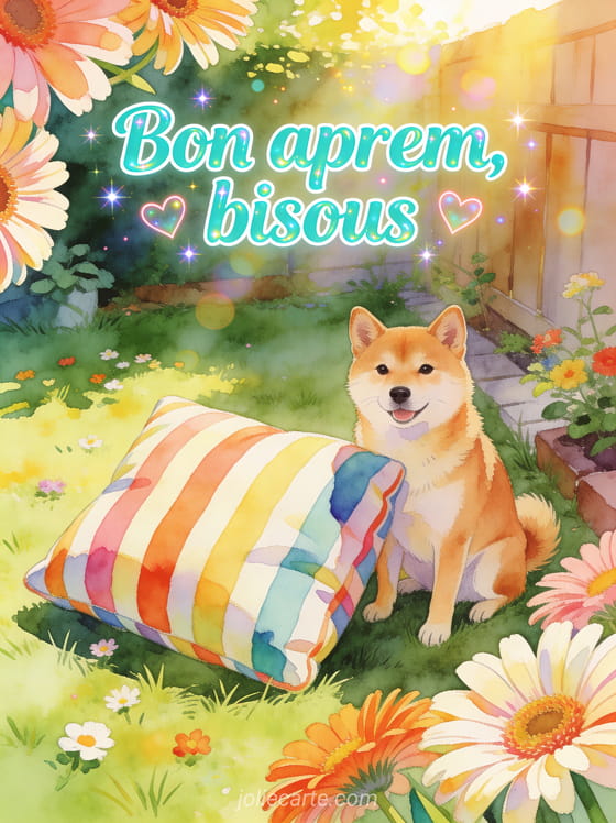 Bon aprem bisous utilise une formule familière et rapide pour envoyer de l'affection sans rallonger le message. Cette carte peut suivre une sieste souhaitée avec douceur, s'adapter à un après-midi de pluie animé ou partir dès les bisous de midi.