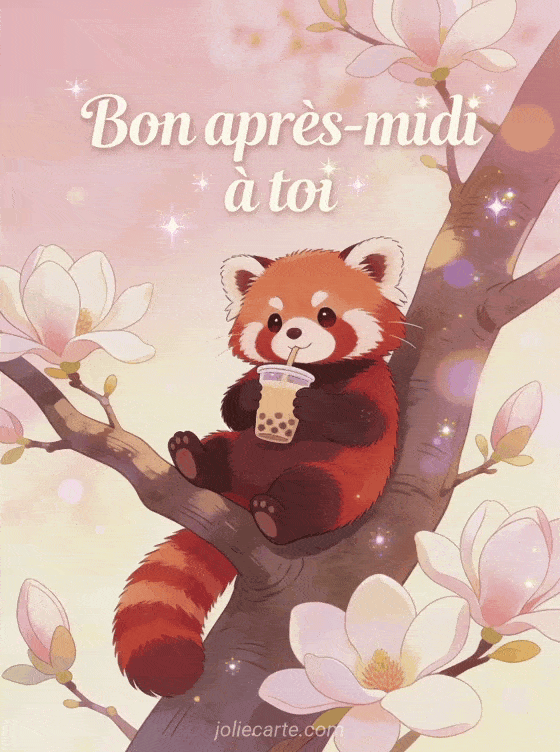 Cette illustration kawaii est irrésistible ! Un adorable panda roux savoure tranquillement son bubble tea, confortablement installé sur une branche de magnolia en fleurs. Les tons pastel roses et crème créent une atmosphère douce et joyeuse, parfaite pour souhaiter un bon après-midi à un ami proche. Découvrez aussi notre carte un bon après-midi, notre image bon après-midi à vous ou notre carte je te souhaite un bon après-midi.