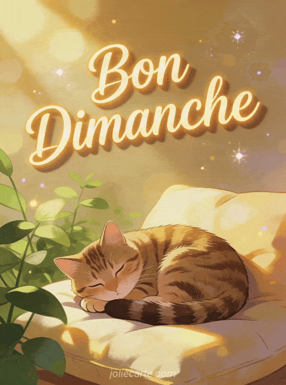 Craquez pour cette carte bon dimanche chat montrant un chat tigré adorable lové sur un coussin ensoleillé près des plantes. Une image douce pour les amoureux des félins souhaitant un dimanche cocooning. Parfaite pour un message tendre félin.