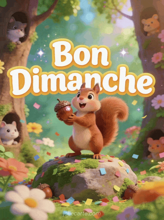 Partagez ce GIF bon dimanche drôle avec un écureuil espiègle pour mettre de la gaieté dans la journée. Une animation rigolote qui fera sourire vos amis et votre famille. Parfait pour un dimanche jovial et des messages amusants entre proches.