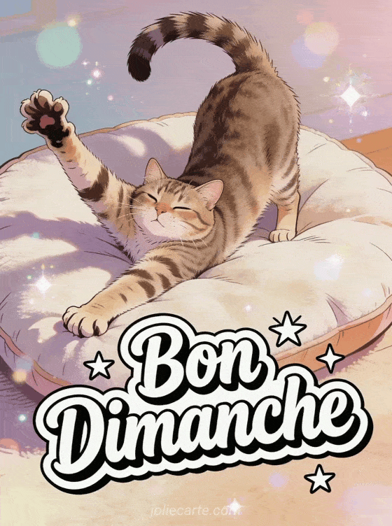 Partagez cette carte bon dimanche humour avec un chat qui s'étire paresseusement sur son coussin. Une image amusante qui résume parfaitement l'esprit du dimanche farniente. Idéale pour envoyer un message léger et faire sourire vos proches.