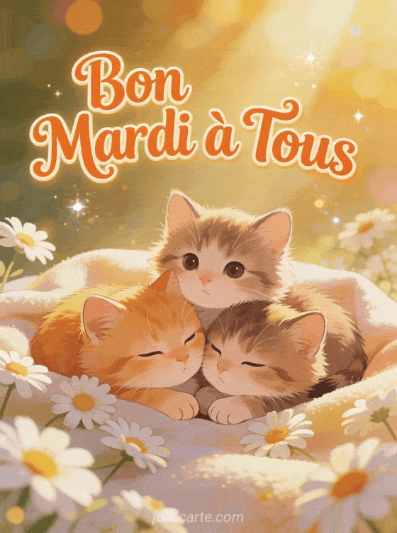 Offrez cette adorable image de bon mardi a tous ceux qui comptent pour vous en un seul envoi chaleureux et convivial. Trois petits chatons blottis ensemble sur une couverture douillette entouree de marguerites incarnent parfaitement l'esprit de partage et de tendresse. Cette carte de bon mardi ravira autant vos amis que votre famille grace a son message universel de bienveillance matinale. La lumiere chaude du matin illumine cette scene attendrissante, ideale pour transmettre vos voeux de mardi a l'ensemble de votre entourage.