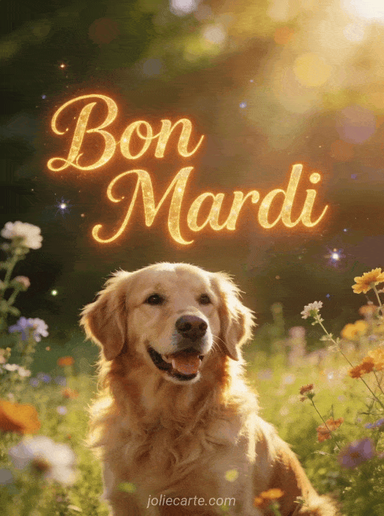 Ce magnifique golden retriever au sourire radieux incarne la joie pure d'un mardi ensoleillĂ© dans la prairie. Son pelage dorĂ© brillant sous la lumiĂšre invite Ă la bonne humeur et aux moments de bonheur simple avec nos amis Ă quatre pattes. Partagez cette tendresse avec les amoureux des animaux et souhaitez-leur une journĂ©e lumineuse comme ce compagnon fidĂšle. Les fleurs sauvages qui l'entourent ajoutent une touche champĂȘtre parfaite pour cĂ©lĂ©brer ce jour de semaine. Envoyez aussi une pensĂ©e fleurie Ă ceux qui ont besoin de rĂ©confort.