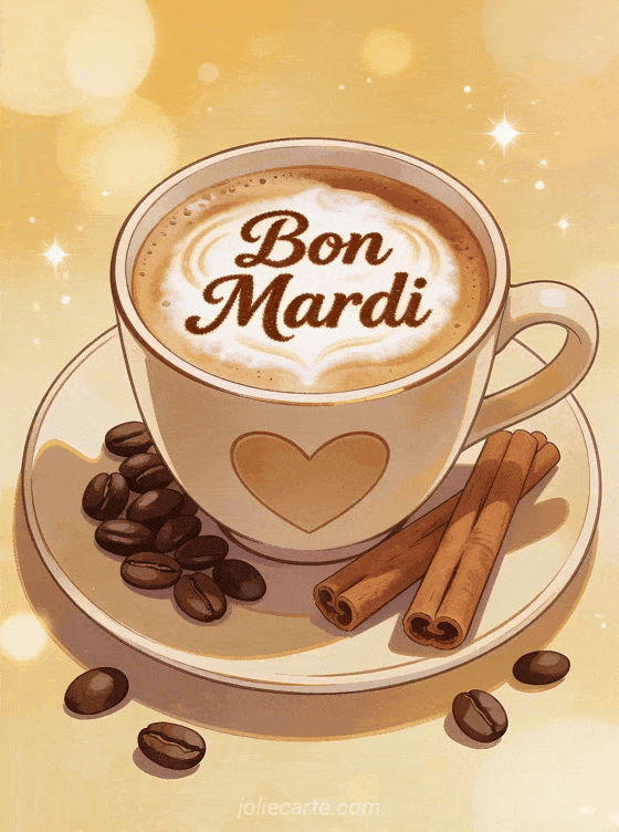 Ce latte art en forme de cœur dans une tasse élégante représente toute l'attention et l'amour que vous mettez dans vos vœux de bon mardi. Les grains de café torréfiés et les bâtons de cannelle ajoutent des notes chaleureuses à cette scène matinale réconfortante. Partagez ce moment café avec les accros à la caféine pour une dose de lumière dans leur journée. L'atmosphère cosy de cette image invite à prendre le temps de savourer les petits plaisirs qui font du bien. Envoyez aussi une bénédiction du matin pour accompagner cette pause gourmande.