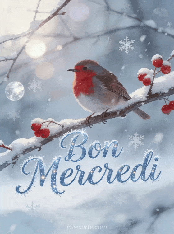 Envoyez cette image « Bon Mercredi » avec un charmant rouge-gorge posé sur une branche enneigée pour partager la beauté de l'hiver. Découvrez aussi un mercredi simple, un mercredi coloré ou un mercredi affectueux.