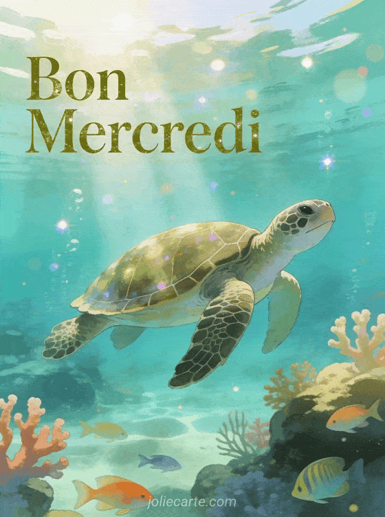 Glissez vers un mercredi serein avec cette majestueuse tortue de mer qui nage paisiblement dans une eau turquoise cristalline au milieu des coraux colorĂ©s et des poissons tropicaux. Cette scĂšne sous-marine apaisante avec ses rayons de soleil qui filtrent Ă travers l'eau crĂ©e une image du mercredi mĂ©ditative. L'atmosphĂšre ocĂ©anique zen de cette carte est parfaite pour partager un bon mercredi plein de sagesse. Offrez ce paysage de rĂȘve pour donner du courage et de la tranquillitĂ©.