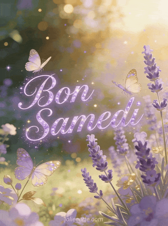 Partagez cette image poetique avec des papillons virevoltant dans un jardin de lavande pour souhaiter un doux samedi. Une attention delicate qui fera plaisir. Decouvrez aussi une carte voyage, une photo de samedi ou un autre gif anime.