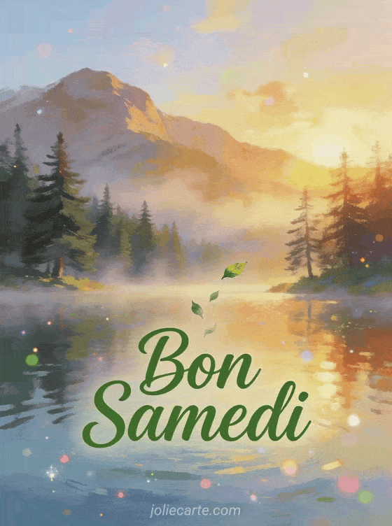 Évadez-vous avec cette carte bon samedi paysage à couper le souffle. L'image présente un lac de montagne brumeux au lever du soleil avec des pins majestueux dans un décor paisible et serein. Parfait pour un bon samedi ou un moment de contemplation.