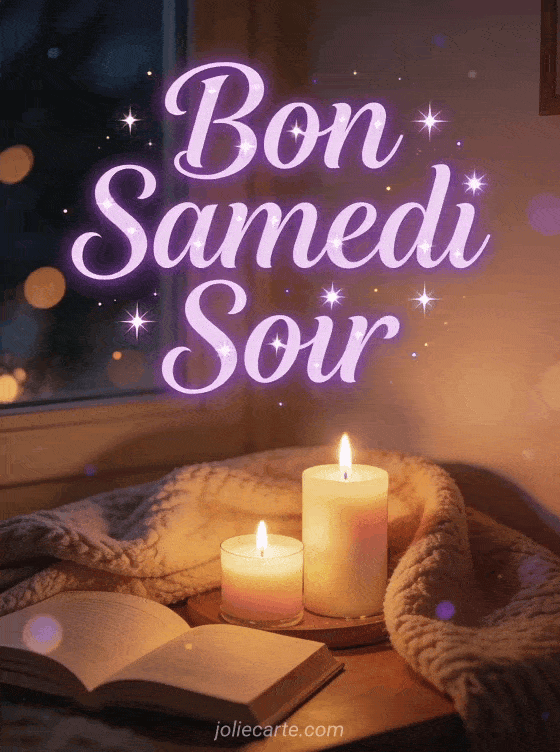 Partagez cette carte bon samedi soir pour souhaiter une agréable soirée de week-end. L'image présente un coin lecture cosy avec des bougies allumées et une couverture dans une atmosphère ambrée et chaleureuse. Idéale pour un bon samedi ou un moment cocooning.