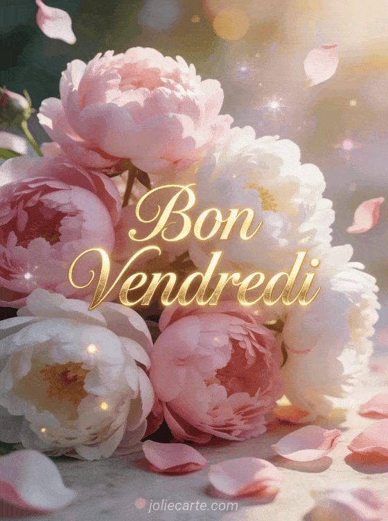 Souhaitez un bon vendredi avec cette carte élégante aux pivoines délicates. Le texte doré apporte une touche raffinée à votre message. Découvrez aussi notre carte bon vendredi avec animaux mignons, notre image bon vendredi avec nounours ou cette carte vendredi sous la pluie.