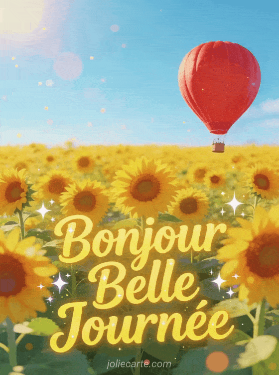 Souhaitez une belle journée avec cette image joyeuse. Un champ de tournesols sous le ciel bleu avec une montgolfière rouge qui s'envole. Découvrez aussi un bonjour magique, un bonjour inspirant ou un bonjour amical.
