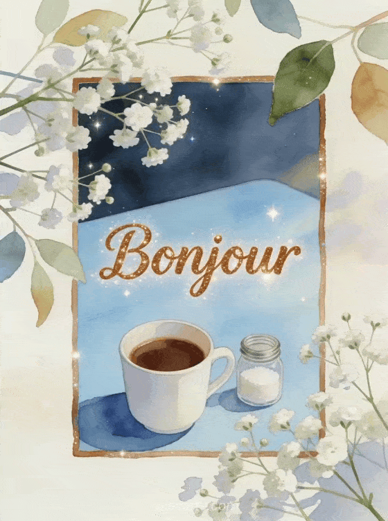 Bonjour bonjour café répète l'attention avec chaleur, comme un petit rituel matinal. Cette carte répond à un bonjour café avec des fleurs, prolonge une photo pour souhaiter bon café et rejoint une photo café du matin.