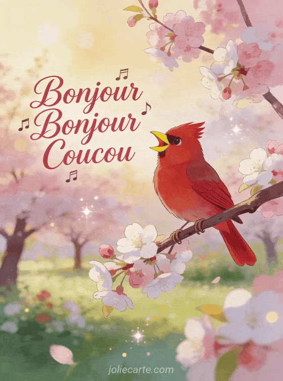 Partagez ce joyeux bonjour bonjour coucou avec un cardinal chantant à l'aube sous les cerisiers. Un réveil musical et printanier. Voyez aussi un coucou copine, un coucou bonjour chat mignon ou une image bonjour originale.