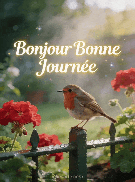 Bonjour Bonne Journée ce petit rouge-gorge matinal vous salue depuis son jardin fleuri de géraniums.