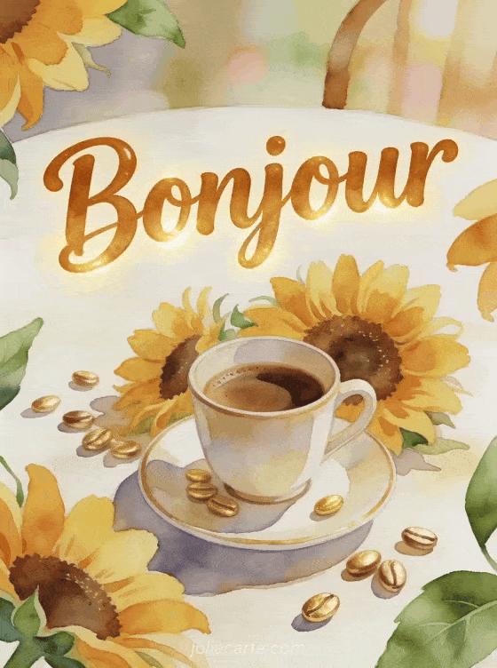 Bonjour café gif rend le message du matin plus vivant, tout en gardant une formule simple. Cette carte accompagne un bonjour avec café et croissants, rassemble un café pour saluer tout le monde et ajoute des bisous au réveil autour du café.