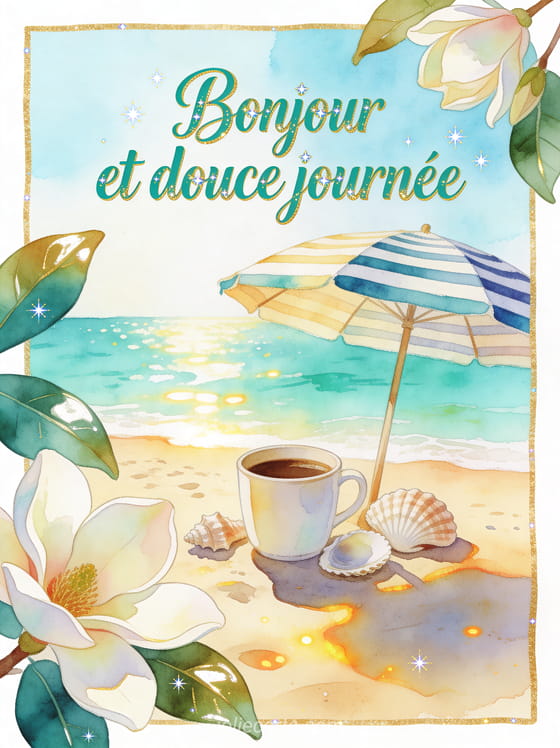 Bonjour café plage apporte une ambiance de matin détendu à votre message. Cette carte prolonge un bonjour au café au lait, rejoint un café pour parler au cœur et dynamise un gif café pour réveiller la journée.